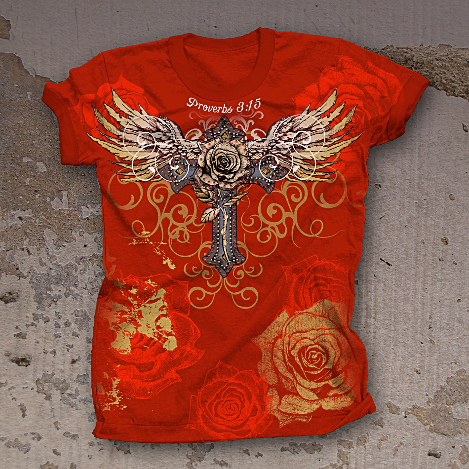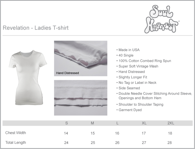 Revelation t-shirts feature vibrant, colorful graphics that match the popular shirts by Ed Hardy and Affliction, but with designs that glorify our Lord & Savior!!! This unique Ladies design is graphically printed on the front and back of a preshrunk, 100% combed ring-spun cotton t-shirt. Each shirt is super-soft vintage washed and hand-distressed. Revelation shirts WILL turn heads, and when they do, maybe The Lord will present the opportunity for you to share The Good News with a lost brother or sister out there! NOTE: Please allow 1-2 weeks for the delivery of your Revelation shirt.